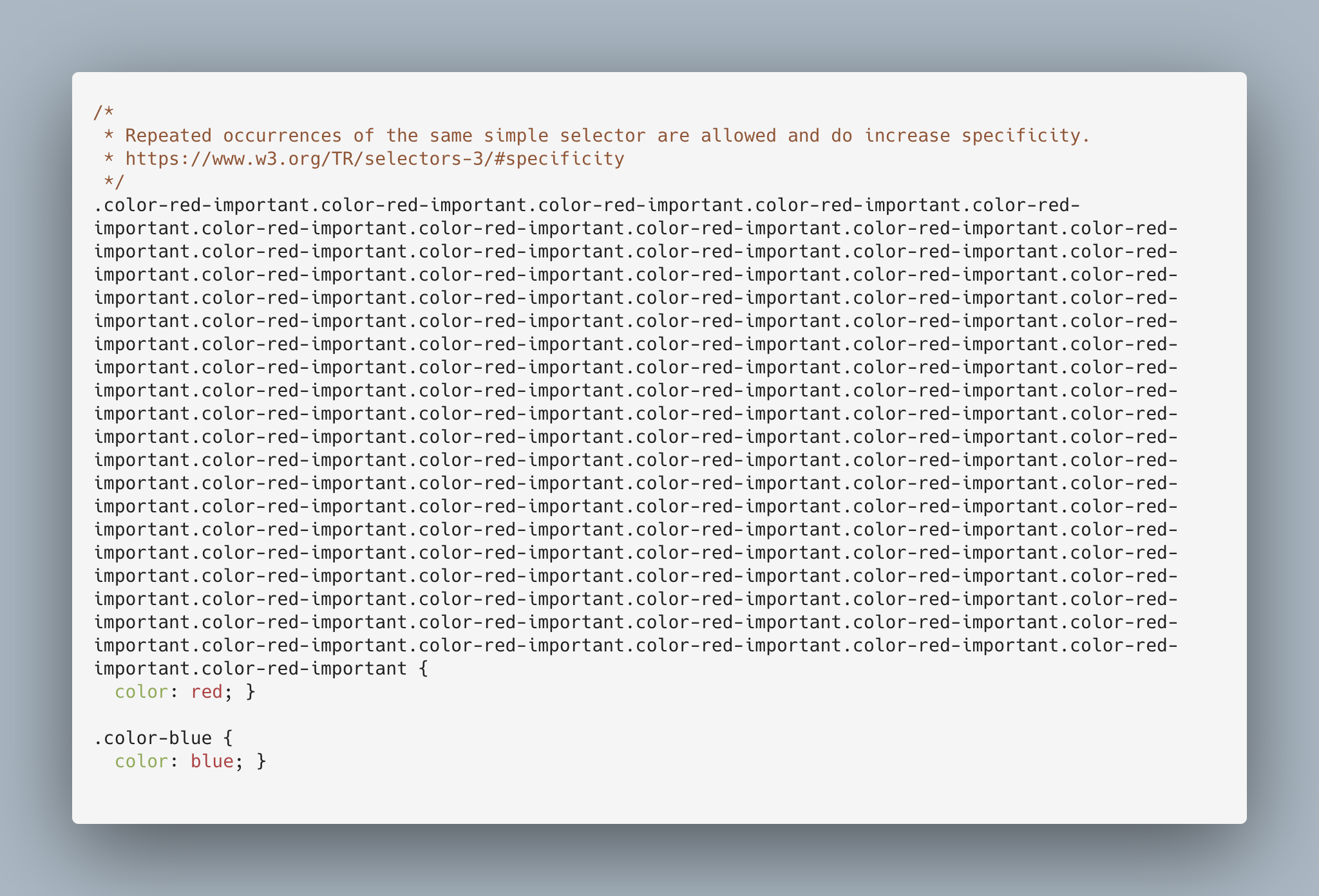 - CSSでは同じセレクタを繰り返し指定でき、繰り返した分だけ詳細度が上がるので、「!important宣言」の変わりに利用できる(という邪悪なコンセプト)