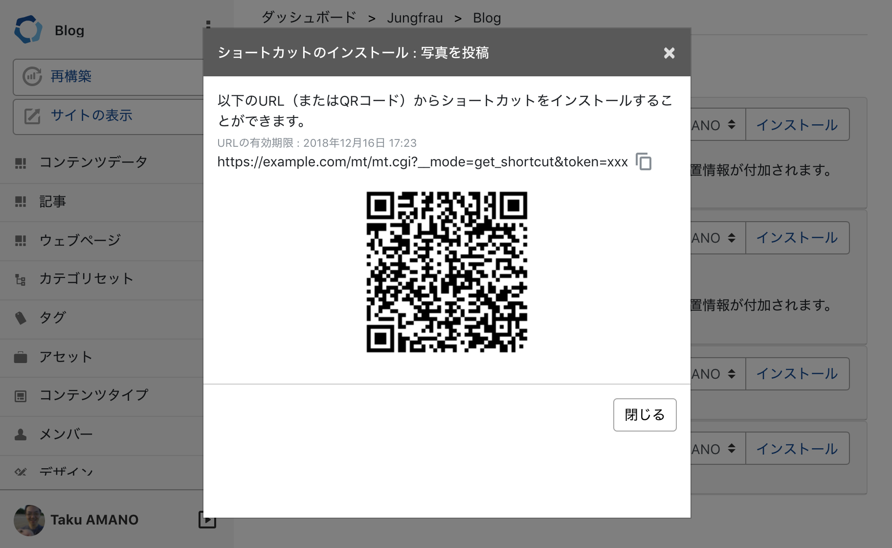 管理者ユーザーでアクセスしている場合には、一覧のインストールボタンの左側にユーザーアカウントの選択肢が表示されます。「パスワードを埋め込む」を選択した場合には、ここで選択したユーザーのWebサービスパスワードが埋め込まれたショートカットを用意できます。これを使うと「管理者ユーザーが代理でMT上で操作を行い、ショートカットの利用者にはメールでインストール用のURLを送る」というような運用をすることができます。