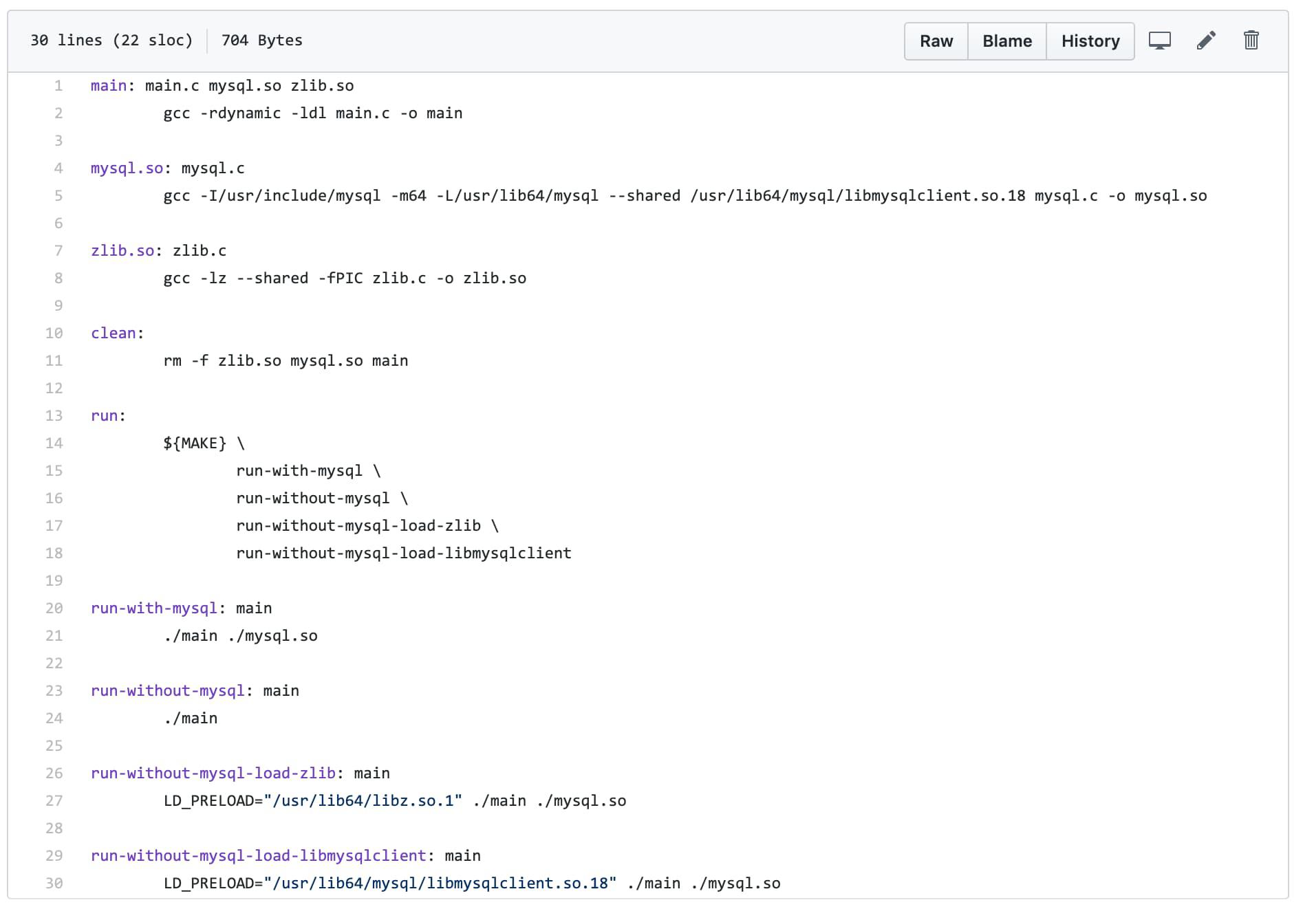 - それらを、libmysqlclient ->libz の順に動的にロードする